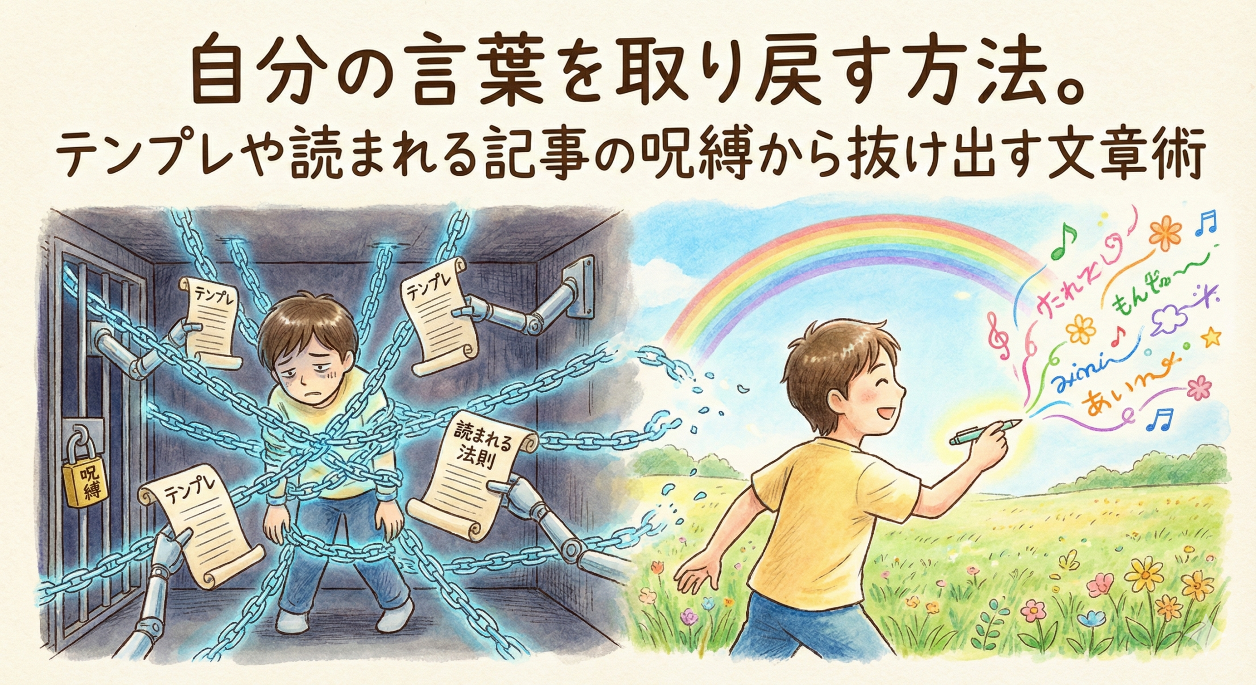 この記事では、テンプレや常識という重い鎧を脱ぎ捨て、あなたの中に眠る「本当の言葉」を取り戻すための具体的なアクションプランをお伝えします。 読み終わる頃には、「下手でもいいから、今の気持ちを書き殴りたい」という衝動が湧き上がってくるはずです。