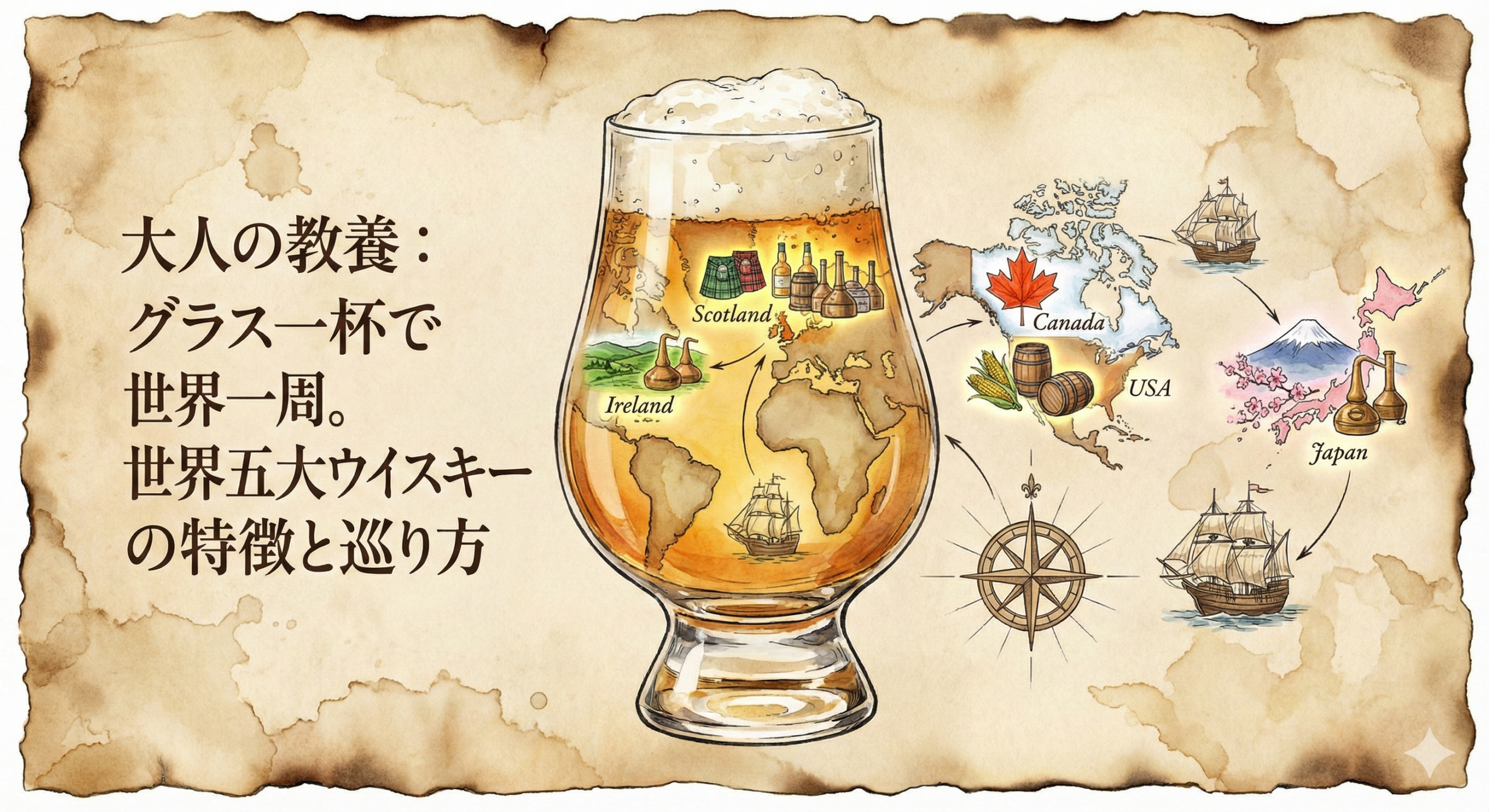 今回は、世界のウイスキー生産量の約6割を占めると言われる「世界五大ウイスキー」について整理します。 これを知っておくと、バーや酒屋の棚が「世界地図」に見えてくるはずです。