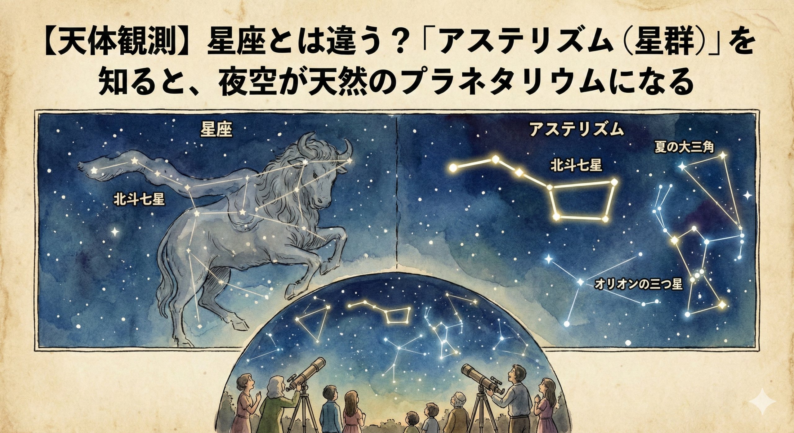 アステリズムとは、星座の枠組みを超えて、目立つ明るい星同士を勝手に繋いで作った「わかりやすい図形」のこと。 いわば、夜空の「非公式なランドマーク」です。