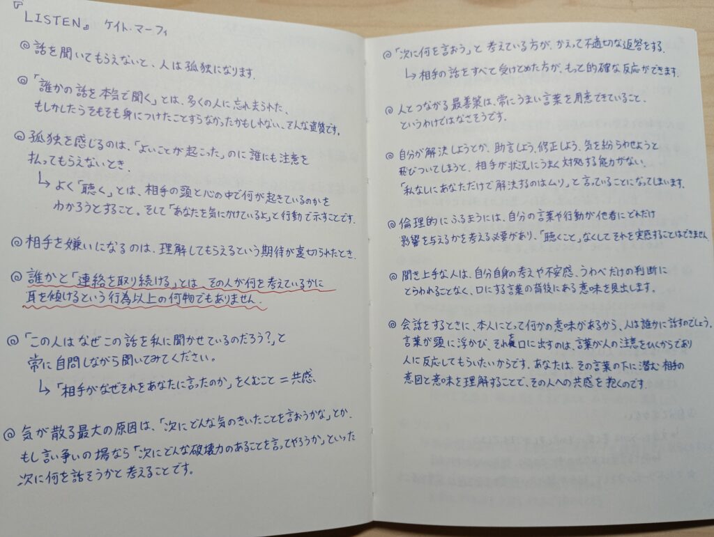 でも、ある一冊の本を読んで、その考えが根本から間違っていたことに気づかされました。 今日は、私の「聞くこと」への価値観を180度変えた本、ケイト・マーフィの『LISTEN』について、自分の読書ノートを見返しながら紹介します。