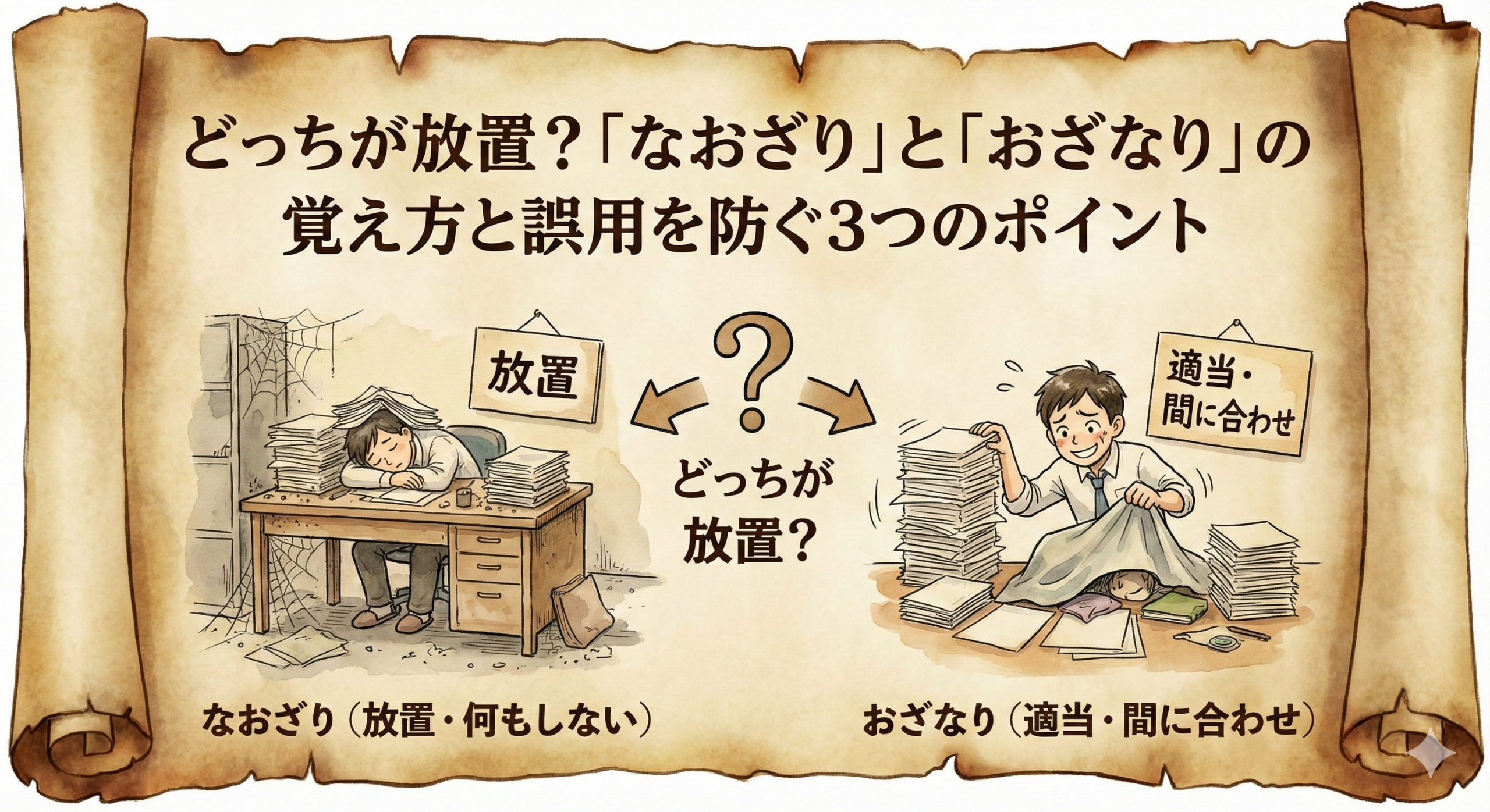 この記事では、多くの大人が密かに勘違いしている「なおざり」と「おざなり」の決定的な違いを、語源からスッキリと解説します。 読み終わる頃には、二度と迷わなくなるだけでなく、言葉を正しく選べる自分に少し自信が持てるようになるはずです。