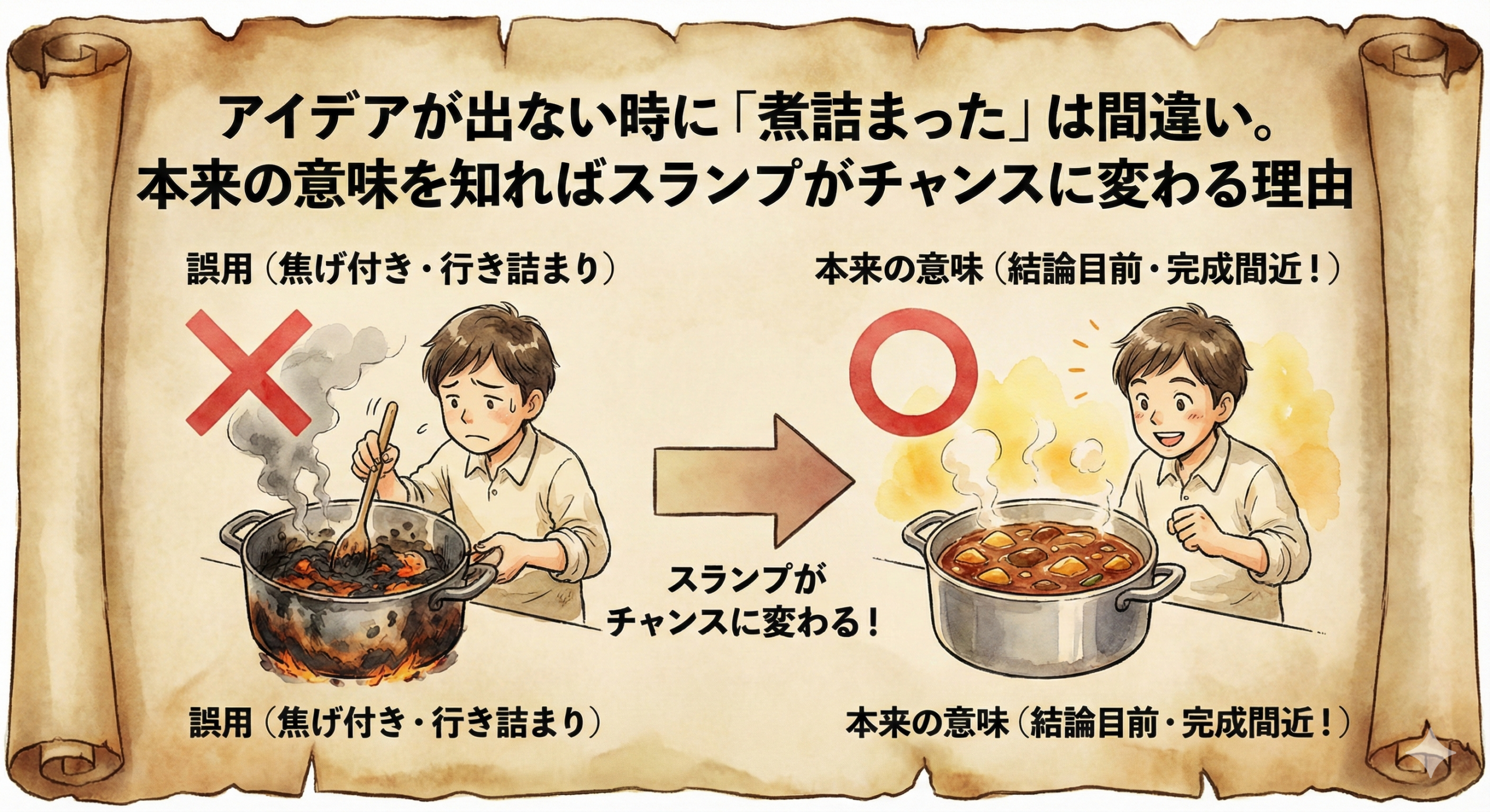 アイデアが出ない時に「煮詰まった」は間違い。本来の意味を知ればスランプがチャンスに変わる理由