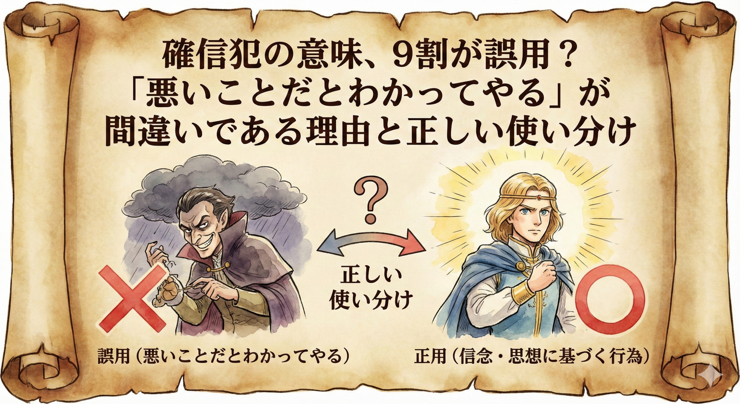 まずは、言葉の定義をクリアにしておきましょう。 私たちが普段「確信犯」だと思って使っている「悪いと知りながらやる行為」。 これは、法律用語や本来の日本語では**「故意犯(こいはん)」**と呼びます。